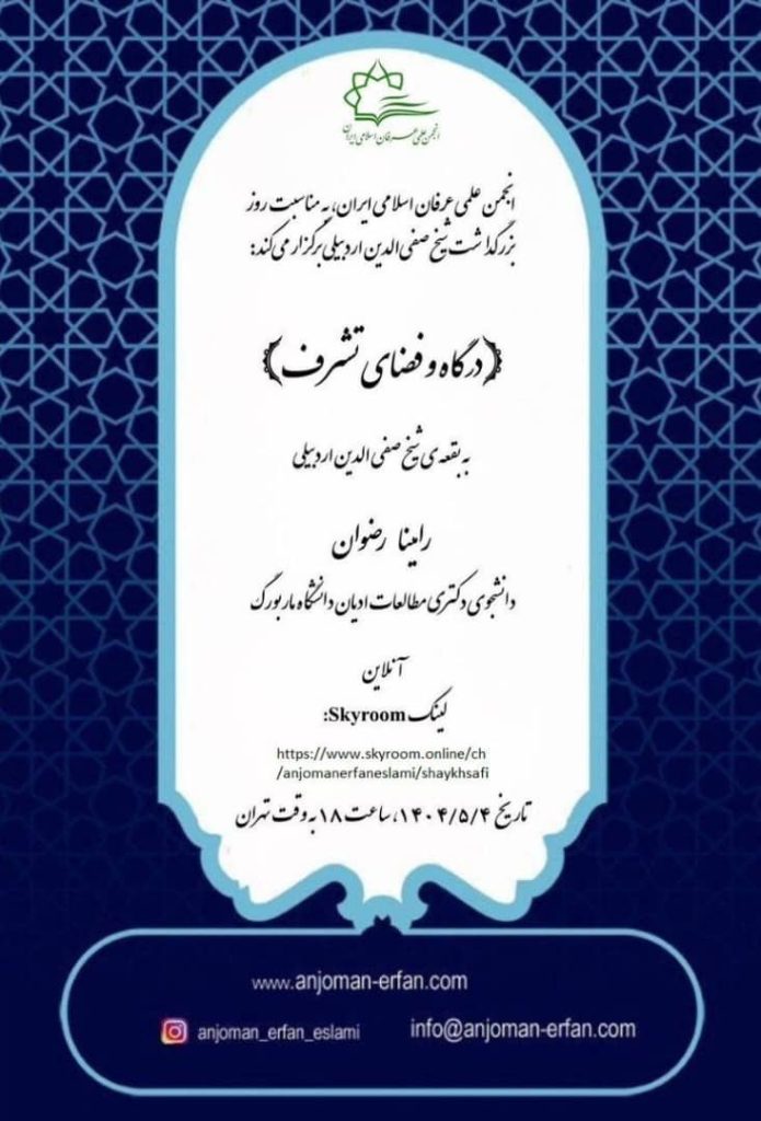 بهمناسبت روز بزرگداشت شیخ صفی الدین اردبیلی، انجمن علمی عرفان اسلامی ایران برگزار میکند: ﴿درگاه و فضای تشرّف به بقعه شیخ صفیالدین اردبیلی﴾ 👤 سخنران: رامینا رضوان (دانشجوی دکتری مطالعات…